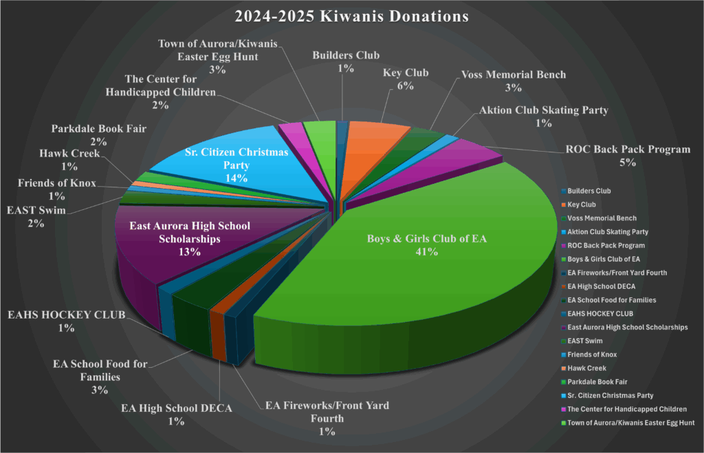 Kiwanis is a non-profit organization of volunteers who work to improve the lives of children in our community through service projects, fundraisers and donations. All the money raised through these fundraisers is put directly back into the East Aurora Community through our donations to The Boys & Girls Club, High School Scholarships, High School Key Club, Middle School Builder’s Club, EAST Swim, Town of Aurora Kiwanis Easter Egg Hunt, East Aurora Senior Center and many other local organizations. Here’s a look at where your Donations went in 2024-2025